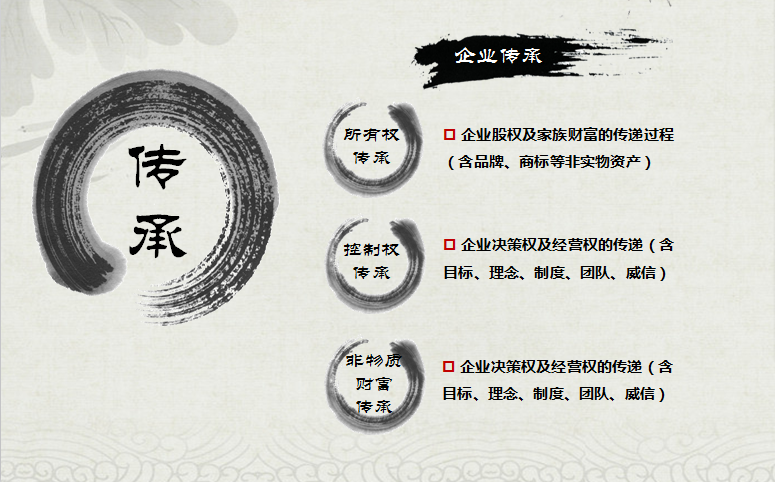 (家族企业是指资本或股份主要控制在一个家族手中,家族成员出任企业主要领导职务的企业。家族企业传承是指企业的所有权和经营权由现在的实际控制人传递给接班人的过程,这个过程传递的是企业的有形资产以及声望、社会地位等无形资产。)